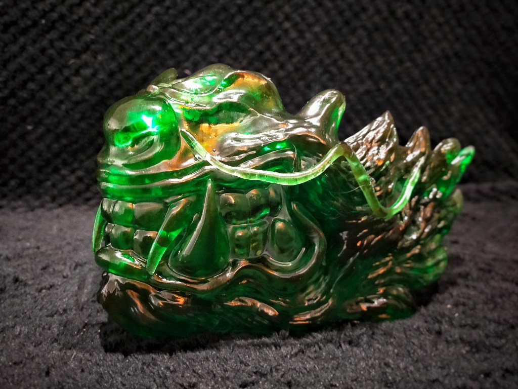 Máscara de dragón chino de media cara. Esta diseñada en 3D e impresa en resina verde traslucida. Tras un proceso de barnizado con barniz ultra gloss se obtiene un acabado final de lo más brillante al estilo dragón de Jade.