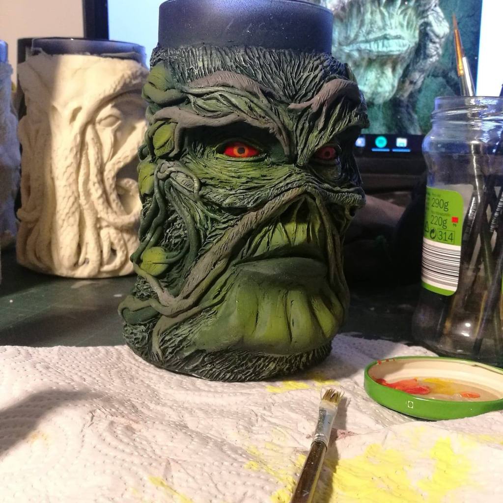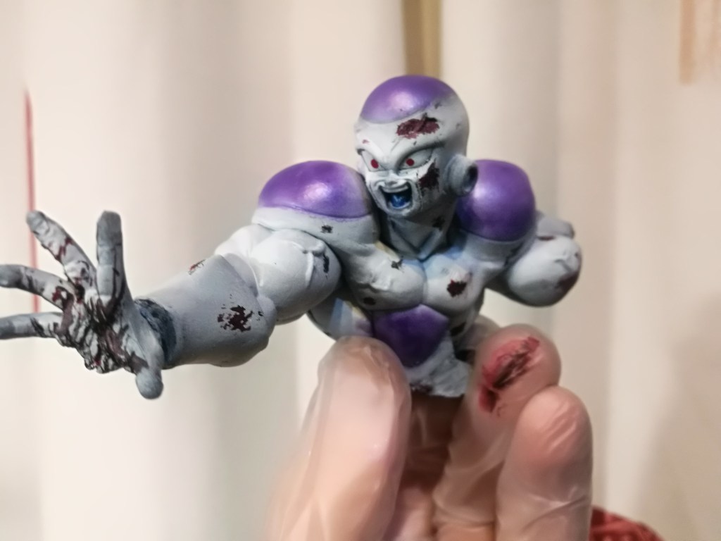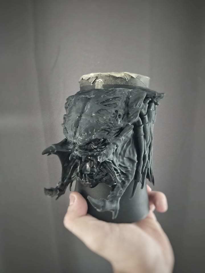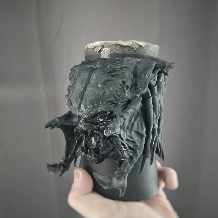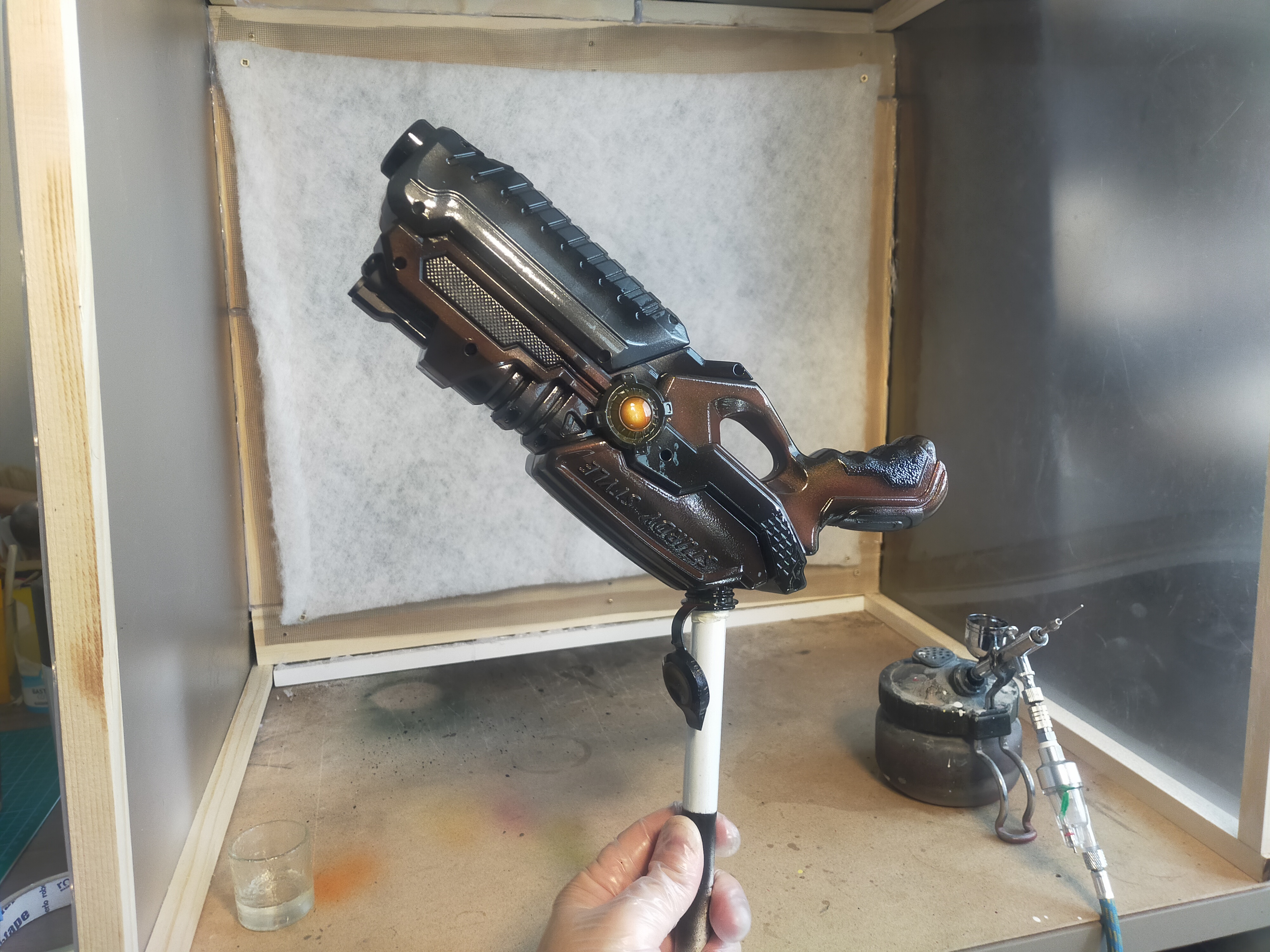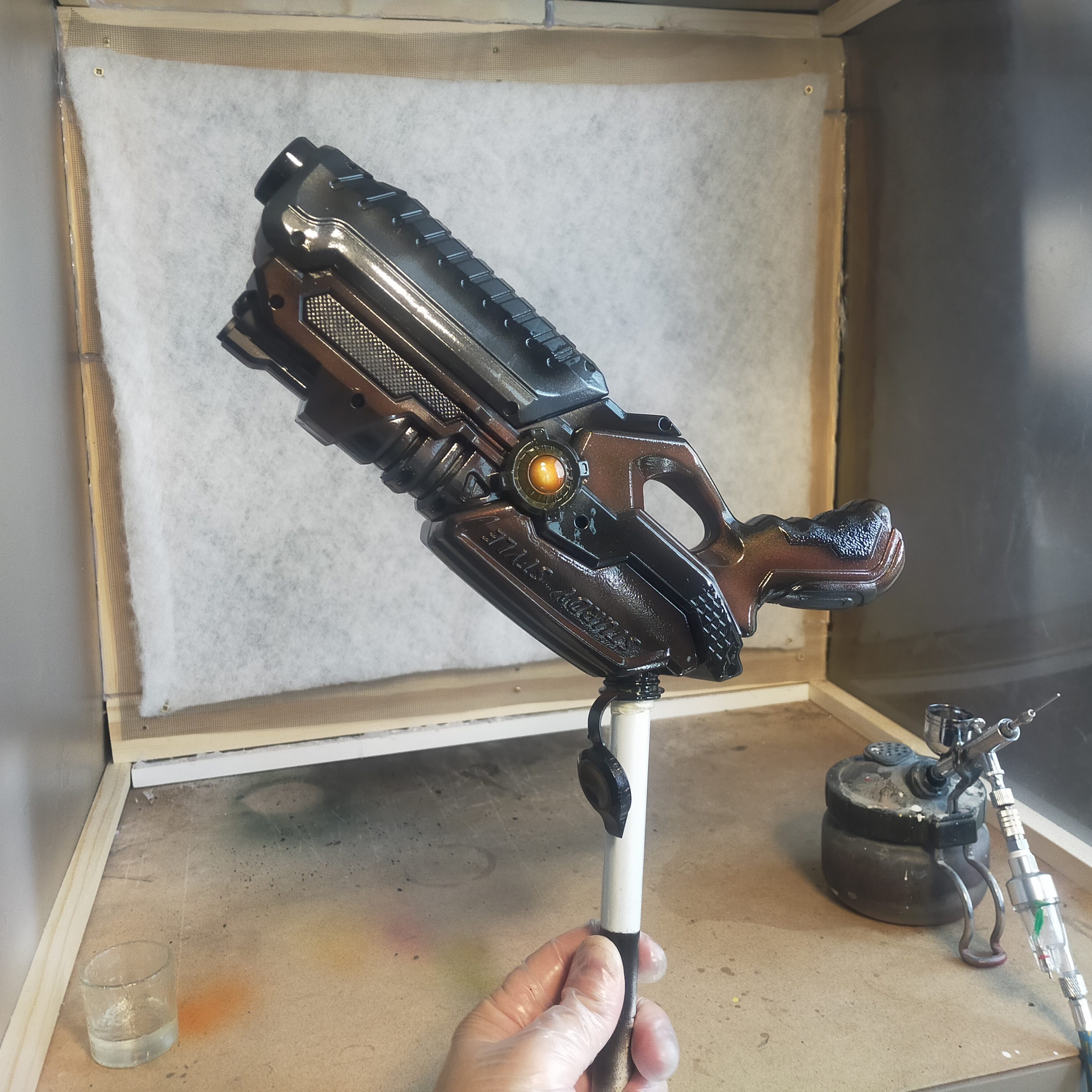 Para las piezas impresas en filamento la tarea se complica. Por una parte tienen una gran ventaja y es que nos ahorramos todo el proceso de limpieza y curado de las piezas, dando paso sólo a retirada de soportes antes de ponernos con el post procesado. Hay varios procesos para seguir hasta conseguir el acabado ideal antes de pintar. Existen resinas de epoxi especiales para cubrir la pieza van bastante bien pero es un coste extra, además de que tienes que dar varias capas. Yo utilizo una pintura especial de relleno que mezclo con masilla de madera aumentando su nivel de relleno, también es un coste extra aunque sea más económico. Aplicando varias capas consigues alisar la pieza notablemente, pero en ambos casos siempre tienes que lijar un poco para suavizar la pieza. Por otra parte descubrí que con la propia resina de impresión puedes cubrir la pieza de filamento y posteriormente curar con la linterna de luz UV. Este proceso no va mal, aunque después tendrás que lijar igualmente. Al final estas piezas necesitan un extra de material para alisar esas marcas de impresión, y un extra de trabajo de lija para suavizar. Finalmente se le da una mano de pintura con aerógrafo para evitar las marcas de la brocha y así ver que zonas necesitan más trabajo.