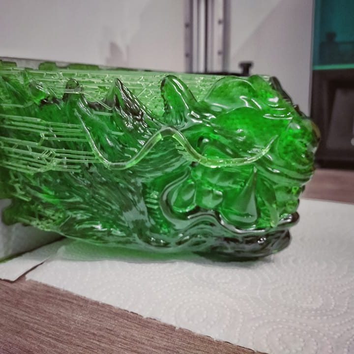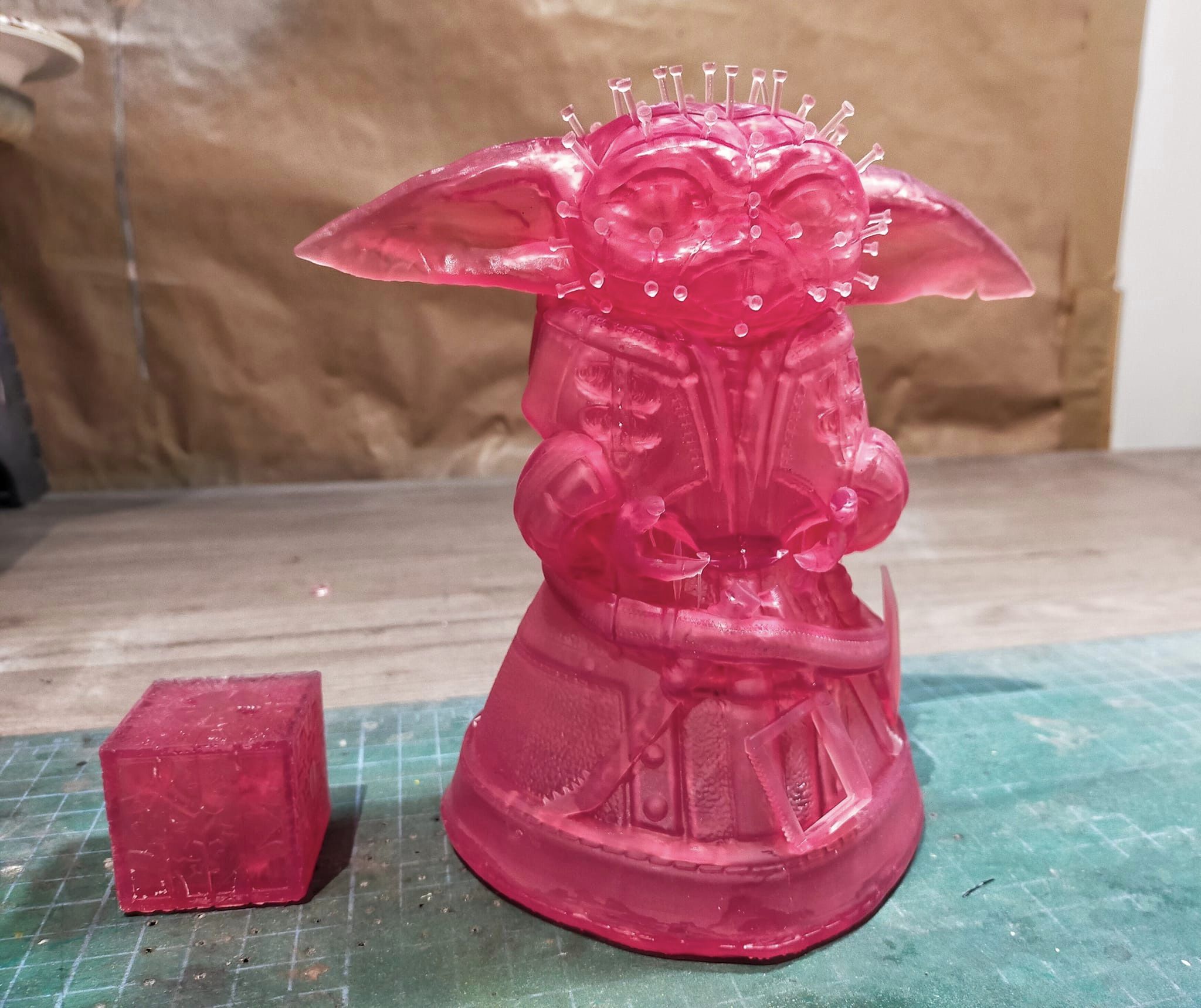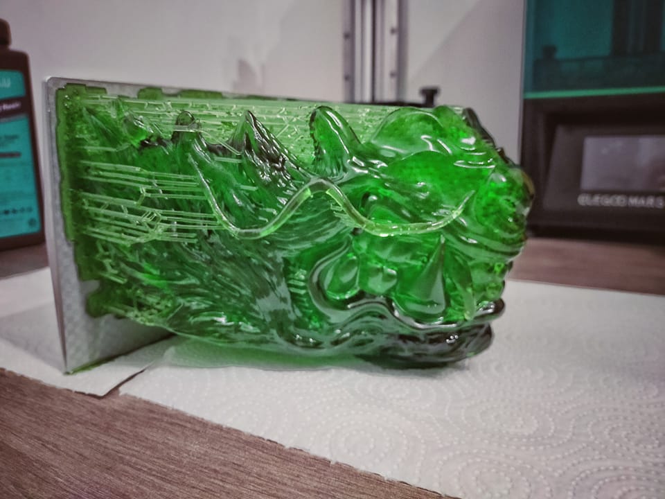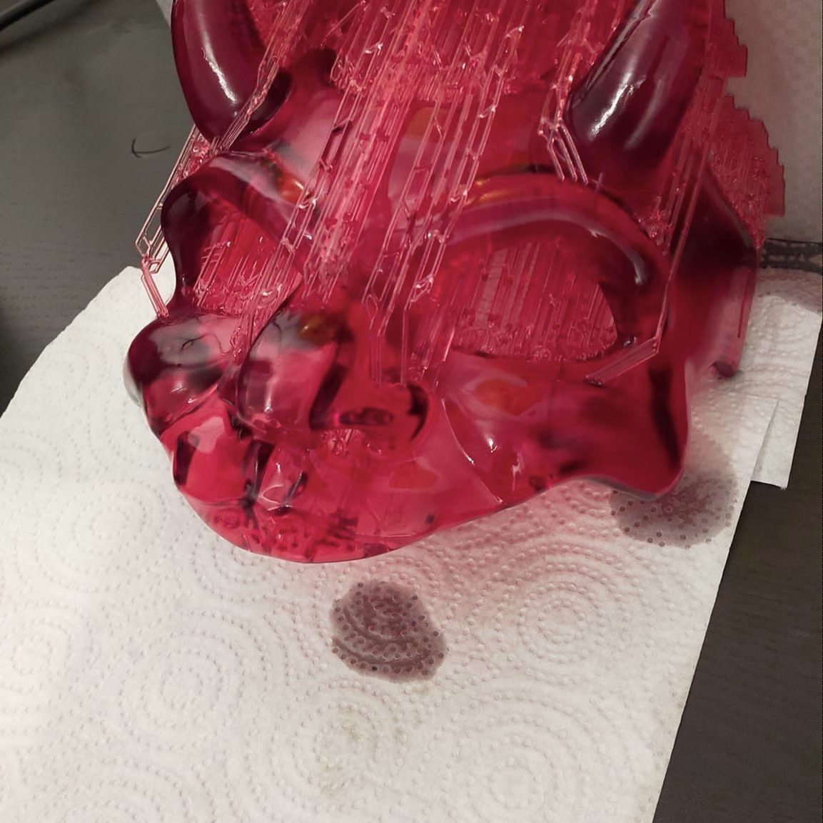A lo largo de los años he utilizado dos tipos de resina en función de su lavado. Están las resinas que se la lavan con alcohol y las que se lavan con agua. Las que se lavan con alcohol son más económicas y en cambio las que se lavan con agua son algo más caras. Al final el dinero que te ahorras en una y la inviertes en el alcohol de limpieza para la otra. Yo utilizo la resina que se limpia con alcohol. Se recomienda usar alcohol isopropílico aunque ya hay resinas que con un alcohol sanitario es suficiente. El alcohol se puede usar varias veces, hasta que llega un poco que no limpia bien. Entonces llega el momento echarlo a un recipiente y llevarlo a un punto limpio. Hay máquinas que te limpian las piezas. Yo personalmente la limpio en un recipiente con ayuda de las manos con guantes y posteriormente seco la pieza con papel de cocina, ya que si no está bien seca y hay restos de alcohol con resina, en el proceso de curado se verán zonas blancas que pueden estropear la pieza.